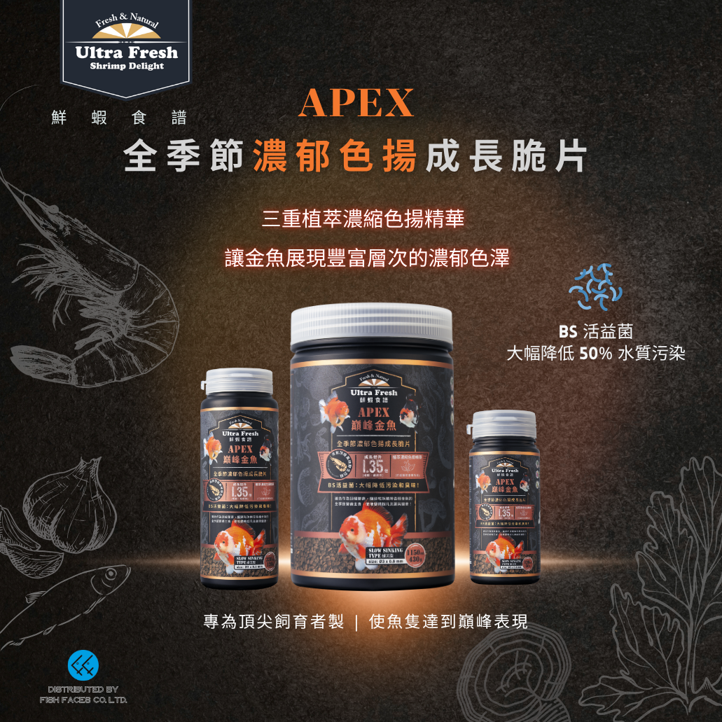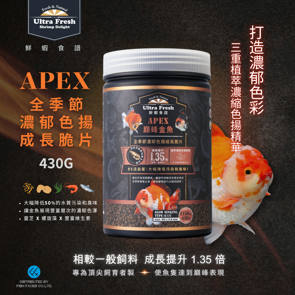 色揚脆片專為追求極致成長和優異適口性的頂尖飼育者研製,使魚隻達到色揚巔峰表現!